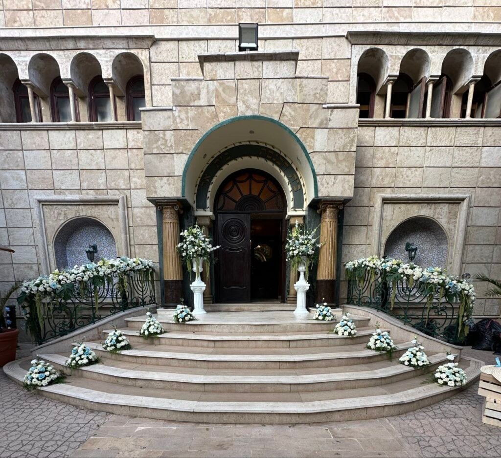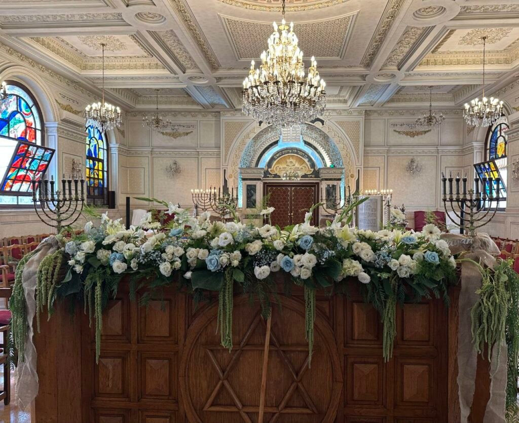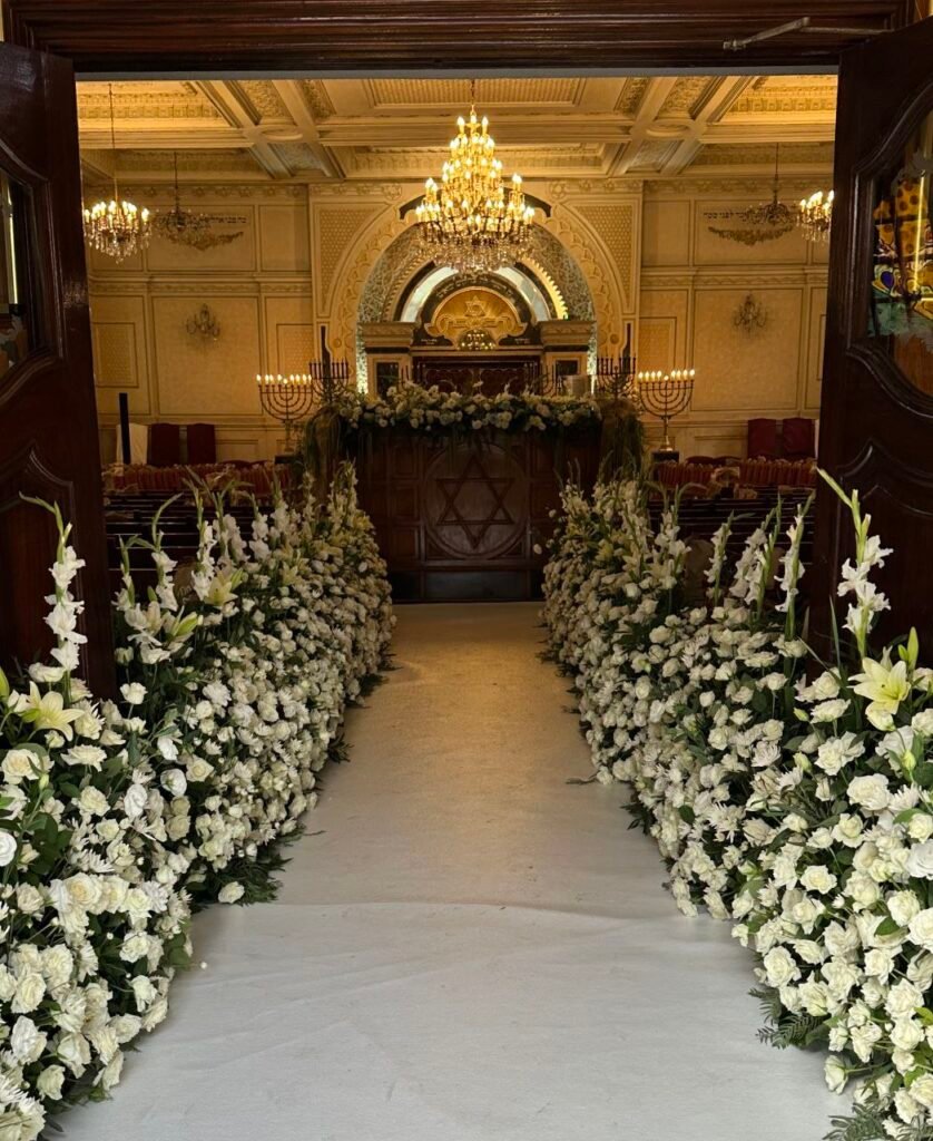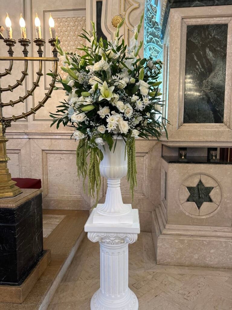 Une mise en scène florale majestueuse pour accompagner ce passage sacré. Nous avons créé une allée de fleurs blanches immaculées soulignant l’élégance de la synagogue pour une cérémonie inoubliable.