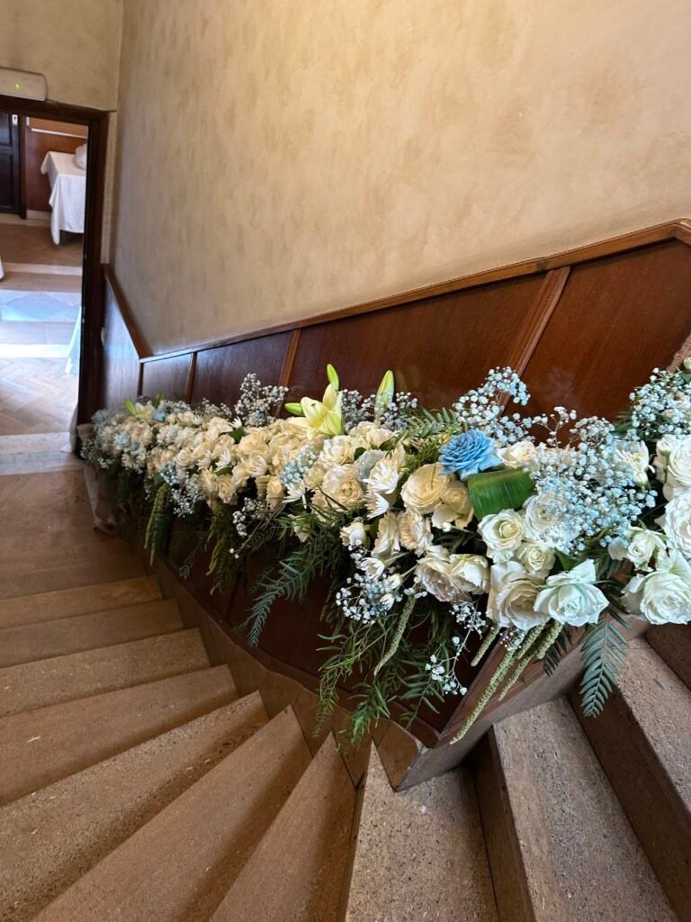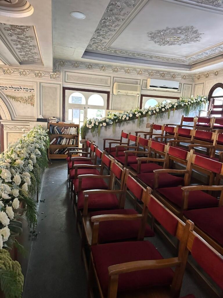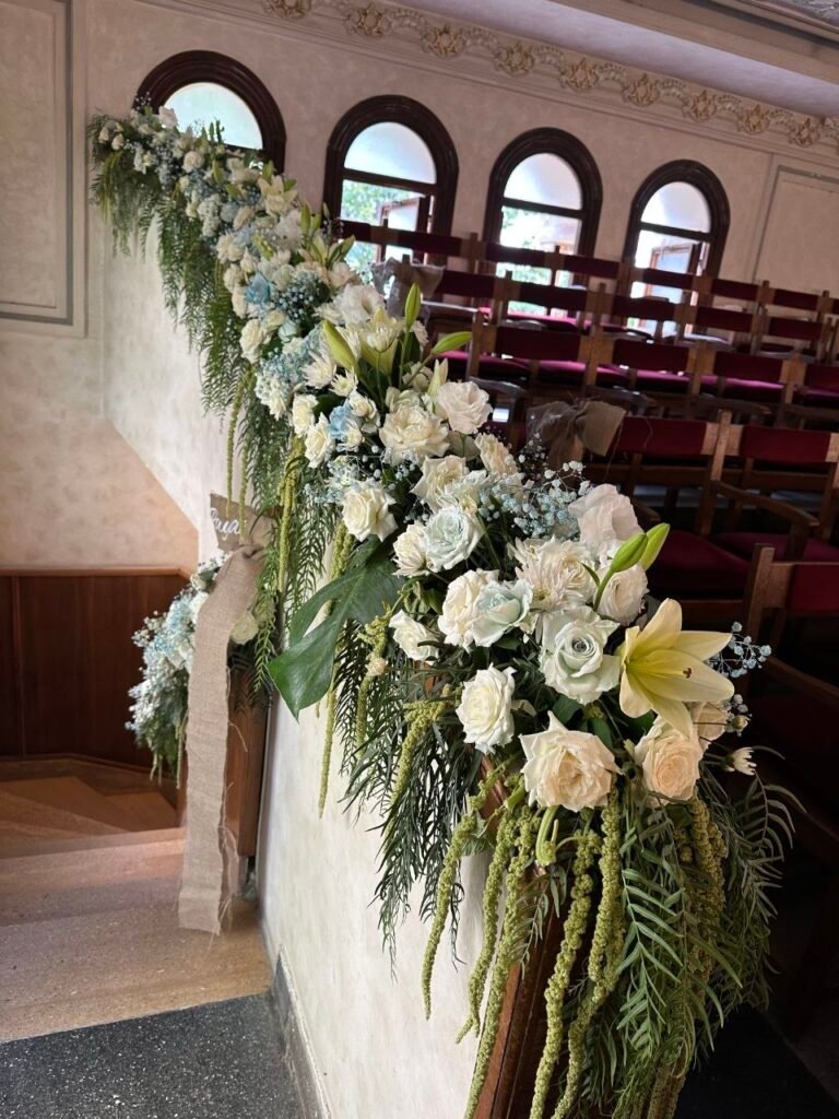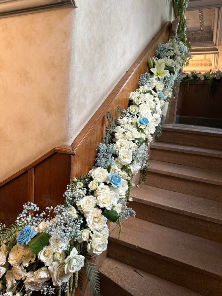 Une mise en scène florale majestueuse pour accompagner ce passage sacré. Nous avons créé une allée de fleurs blanches immaculées soulignant l’élégance de la synagogue pour une cérémonie inoubliable.